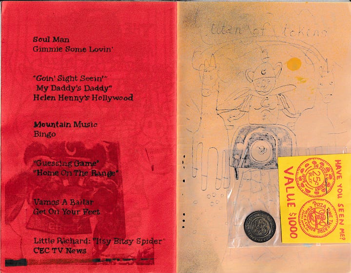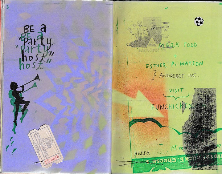 Welcome to a new feature where I dig through my zine library at Outlet and share! I am keeping the Mark Todd and Esther Pearl Watson love going by showcasing some scans of one of my most beloved zines, Chuck Cheese Please: Insane but True, made by them in 2006. This zine features all of the qualities that I love about making zines. Here, let me make a list!